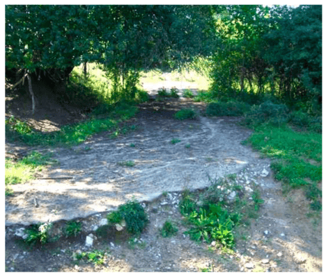 1975 wurde das ganze Dorf zugunsten des Erzabbaus dem Erdboden gleichgemacht, auch die alte Dorfstraße, deren Reste wir noch unter dem Gras sehen können.